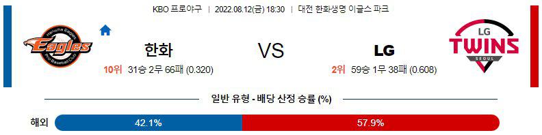 한국프로야구 한화 이글스 LG 트윈스의 경기가 오는 금요일(8/12) 18:30 한화의 홈 구장인 한화생명 이글스 파크에서 열릴 예정입니다. 한화 이글스 LG 트윈스 양 팀 간의 이번 주중 3연전 가운데 마지막으로 펼쳐지는 경기입니다.