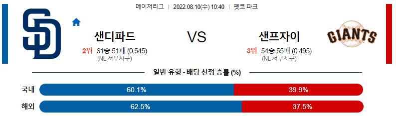 8월 10일 10:40 MLB 샌디에이고 : 샌프란시스코 MLB분석