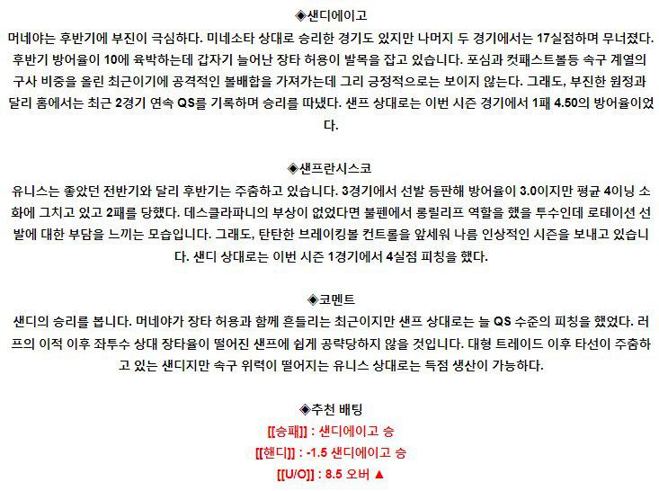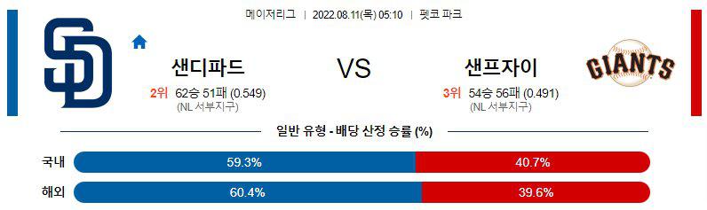 8월 10일 10:40 MLB 샌디에이고 : 샌프란시스코 MLB분석