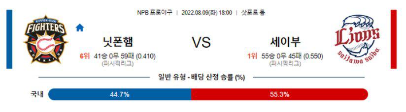 지난주 3승1무2패 성적을 기록한 니혼햄과 5승1패의 상승세를 만들어 낸 세이부의 만남이다. 2연승을 기록하고 있지만 최근 3경기에서 연속 4실점 이상을 기록중인 이토 히로미 투수 보다는 3경기 연속 7이닝 이상 2실점 이하 투구내용을 보여주고 있는 다카하시 코나 투수게 대한 기대치가 높은 선발 매치업 이다. 세이부 승리 가능성을 추천 한다.
