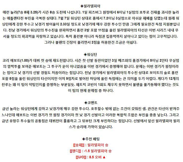 ◈애리조나 잭 갤런(6승 2패 3.31)이 시즌 7승 도전에 나섭니다. 3일 클리블랜드 원정에서 5.2이닝 3실점의 투구로 승리를 거둔 갤런은 후반기 투구 내용은 나쁘지 않은 편입니다. 특히 홈 경기에서 아직 패배가 없기도 하고 홈경기 방어율이 피안타율이 .192일 정도로 홈에서 강한 투수라 6이닝 2실점은 충분히 해줄 가능성이 높은 편입니다. 전날…