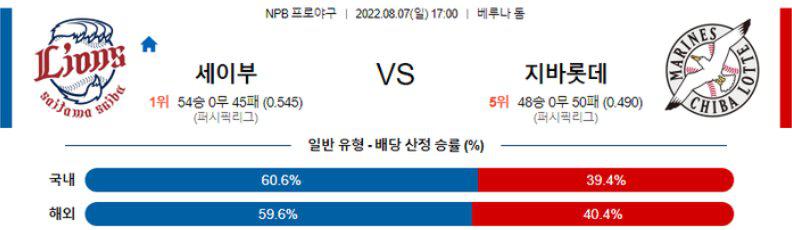 세이부의 승리를 점친다. 지난 경기 득점권에서의 활약은 매우 아쉬웠지만 타격감 자체는 지바롯데 보다 좋아보였다. 모리의 잠재력은 높게 평가할 수 있겠지만 아직 1군 수준에서 선발로 증명된 것은 없는 투수. 세이부 타자들이 공략하지 못할 수준은 아닌 것으로 보인다. 엔스의 최근 이닝 소화능력은 다소 아쉽지만 지바롯데 타자들의 타격감을 고려하면 5~6이닝 정도는 최소 실점으로 막아줄 수 있을 것으로 보인다.