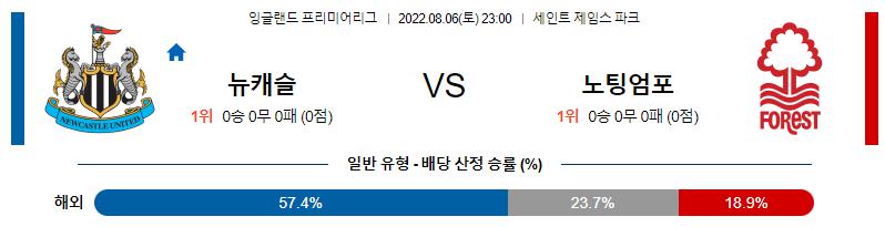 노팅엄이 강력한 3백을 바탕으로 지난 시즌 원정에서 경기당 평균 0점대의 실점률을 보유하고 있는 점을 고려하면 언더(2.5 기준) 가능성도 있겠다. 또한 뉴캐슬은 지난 시즌 중동 자본 유입으로 인해 많은 선수들을 사왔고, 수준급의 스쿼드를 갖춘 상태. 지난 시즌 막판에는 4연승을 기록하는 등 조직력과 경기력이 점점 올라오는 추세였다. 노팅엄도 23년만에 승격으로 무려 12명의 선수를 영입하며 경쟁력을 갖추기 위한 노력을 하고는 있으나, 이들의 조직력은 의문 부호가 붙어 있는 상황. 이번 일정도 뉴캐슬의 승리가 예상된다.