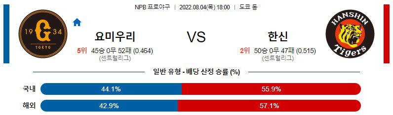8월4일 NPB 일본 프로야구 요미우리 자이언츠 한신 타이거스 경기분석을 시작하겠습니다. 이번경기는 오후 6시에 시작이 되는 경기인데 요미우리가 한신을 홈에서 맞이하게되는 경기입니다. 요미우리 자이언츠 한신 타이거스 두 팀은 센트럴리그에 속해있는데 요미우리는 5위를 기록중이고 한신은 2위를 기록중입니다.