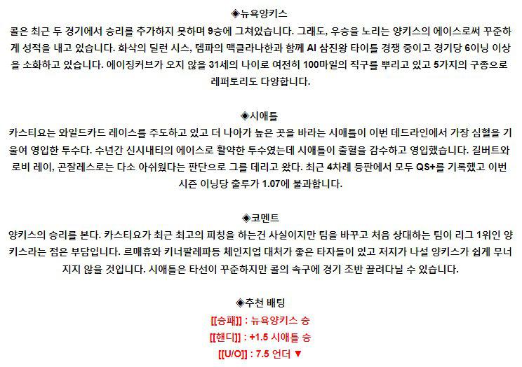 탬파베이 (템파베이) 레이스 (54승 0무 48패 / AL 동부 3위) 선발 평가 / ★★★★ : 라스무센 (17경기 6승 3패 ERA 3.17) 지난 등판에서는 볼티모어를 상대로 4.2이닝 3실점으로 부진했으나 타선의 도움으로 패전 투수가 되지 못했다. 성적은 좋아보이지만 기본적으로 많은 이닝을 소화하지는 못하는 투수로, 올 시즌 6이닝 이상 투구를…