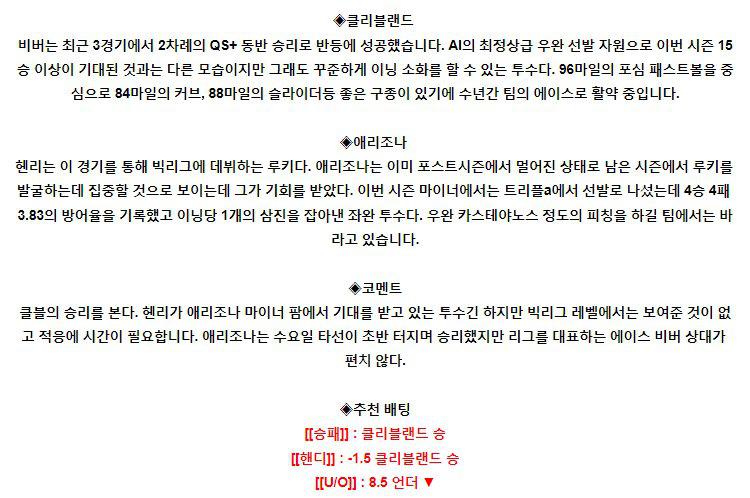탬파베이 (템파베이) 레이스 (54승 0무 48패 / AL 동부 3위) 선발 평가 / ★★★★ : 라스무센 (17경기 6승 3패 ERA 3.17) 지난 등판에서는 볼티모어를 상대로 4.2이닝 3실점으로 부진했으나 타선의 도움으로 패전 투수가 되지 못했다. 성적은 좋아보이지만 기본적으로 많은 이닝을 소화하지는 못하는 투수로, 올 시즌 6이닝 이상 투구를…
