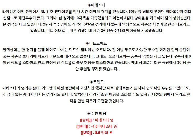 탬파베이 (템파베이) 레이스 (54승 0무 48패 / AL 동부 3위) 선발 평가 / ★★★★ : 라스무센 (17경기 6승 3패 ERA 3.17) 지난 등판에서는 볼티모어를 상대로 4.2이닝 3실점으로 부진했으나 타선의 도움으로 패전 투수가 되지 못했다. 성적은 좋아보이지만 기본적으로 많은 이닝을 소화하지는 못하는 투수로, 올 시즌 6이닝 이상 투구를…