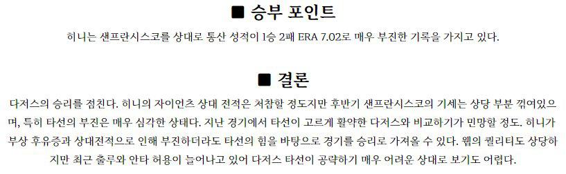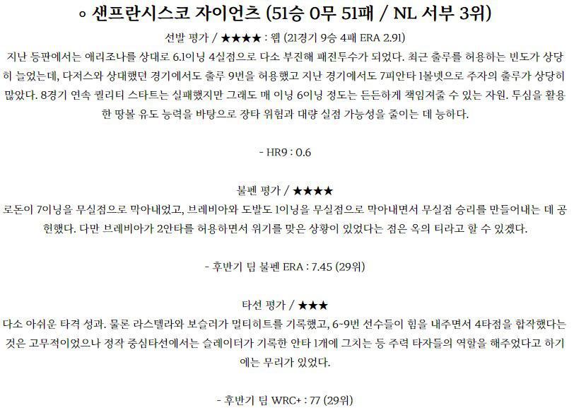 한화 이글스 (28승 2무 63패 / 리그 10위) 선발 평가 / ★★★★ : 장민재 (21경기 4승 4패 ERA 3.67) 우천 취소로 인해 로테이션이 밀렸지만 선발 투수 변동은 없다. 시즌 초반에는 이닝 소화능력에서 기복이 조금 있었으나 최근 5경기에서는 ERA 1.69로 매우 좋은 모습을 보여주고 있다. 빠른공을 던지는 공은 아니지만 커맨드가 괜찮…