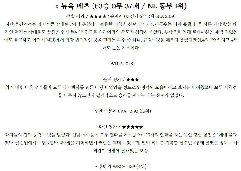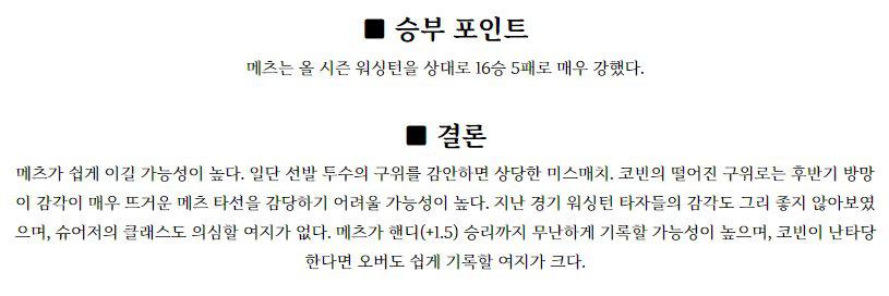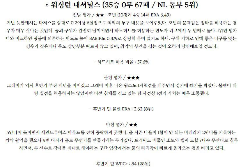 워싱턴(35승 67패 / 조시아 그레이 7승 6패, 4.45) 그레이는 직전 보스턴과의 경기에서 6이닝 1실점을 기록했다. 이날 커브와 슬라이더 강점이 제대로 나오면서 호투를 펼쳤다는 점은 긍정적으로 볼만했다. 다만 이날 약간의 운빨이 작용했고 포심이 좋지 않았다는 점, 그리고 올시즌 전반적으로 홈에서 고전했다는 점(2승6패 6.70)을 감안해본다면 오…
