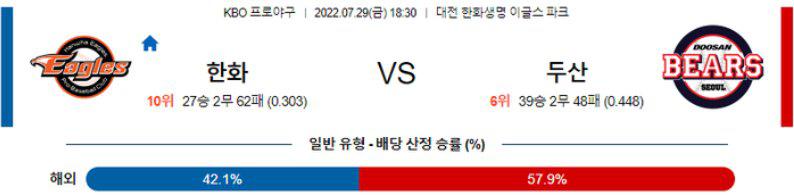 타선의 비교에서 전일 경기 3-3 무승부를 기록하며 이틀 연속 헛심만 쓴 한화 보다는 3연승의 상승세를 만들어 낸 두산 타선에 대한 기대치가 높은 타이밍 이다. 또한, 최승용 투수는 7월에 이전괴는 다른 좋은 모습을 마운드 위에서 보여줬다. 두산 승리 가능성을 추천 한다.