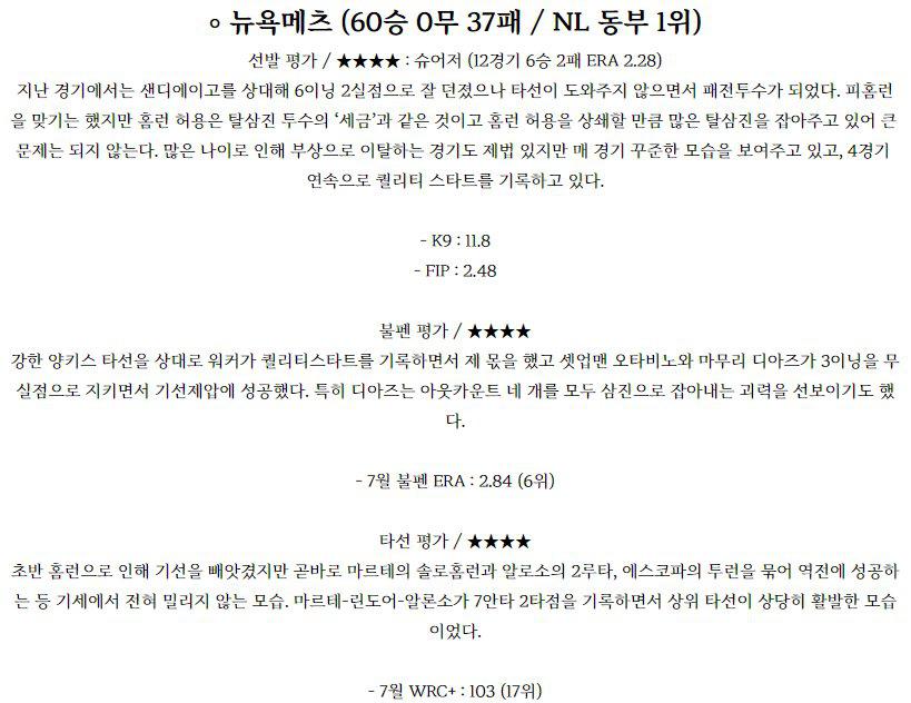 ◈보스턴 커터 크로포드(2승 3패 4.50)가 시즌 3승 도전에 나선다. 24일 토론토와의 홈경기에서 6이닝 3실점의 투구를 보여준 크로포드는 7월 방어율이 2.82로 거의 매 경기 QS 내외의 투구를 해낼수 있는 능력을 증명중입니다. 특히 동부 강팀 상대로 호조를 이어간다는 점에서 이번 경기도 QS 이상을 기대해볼 여지는 꽤 있는 편. 전날 경기에…