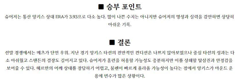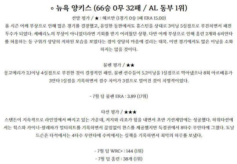 ◈뉴욕양키스 제이미슨 타이욘(10승 2패 3.93)이 시즌 11승 도전에 나선다. 23일 볼티모어 원정에서 2.2이닝 2실점의 부진으로 시즌 최악의 조기 강판을 당했던 타이욘은 얼마나 빠르게 페이스를 찾느냐가 관건입니다. 다행스러운 점은 그나마 홈 경기 투구가 좋다는 점이지만 최근의 타이욘을 고려한다면 일단 QS가 목표일수도 있습니다. 전날 경기에서…