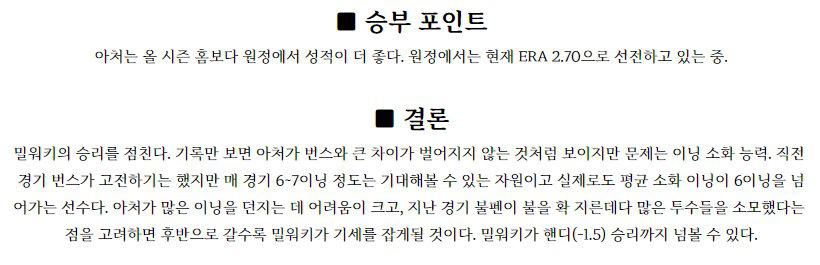 삼성(수아레즈 4승5패 2.27) 수아레즈 투수는 직전경기(7/22) 원정에서 키움 상대로 구원으로 나와서 2.1이닝 무실점 노디시전을 기록했으며 이전경기(7/9) 홈에서 SSG 상대로 6이닝 4실점(비자책) 노디시전을 기록했다. 2연승 흐름 속에 올시즌 KBO 무대 데뷔후 18경기 4승5패, 9경기 QS 성적이며 5월 5경기 승패없이 2.35, 6월 …