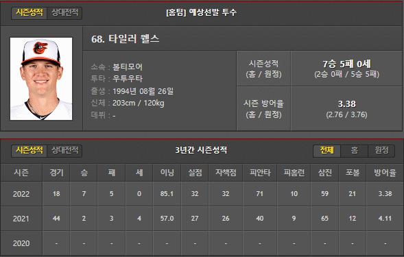 볼티모어는 이번 경기 타일러 웰스 선수가 선발로 등판합니다.