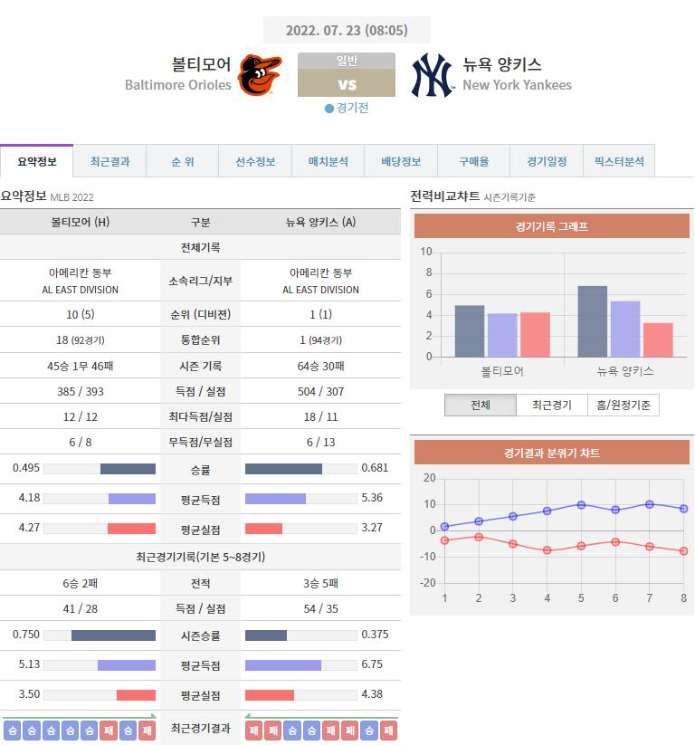 [스포츠분석][MLB분석] 7월 23일 MLB 분석 볼티모어 VS 뉴욕양키스