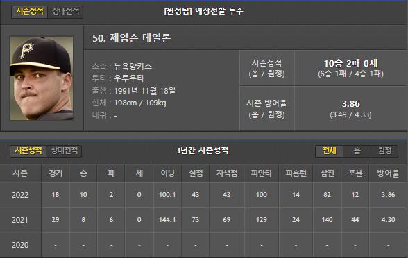 테일론은 이번 시즌 18경기 10승 2패 100.1이닝 100피안타 43실점으로
