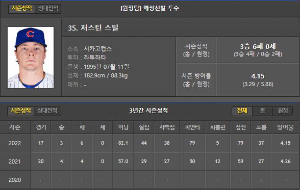 컵스는 이번 경기 저스틴 스틸 선수가 선발로 등판합니다.