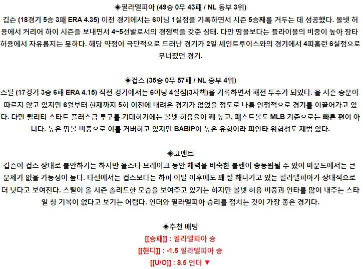 안녕하세요 스포츠 리포터 세린입니다. 오늘 NPB 분석은 마이애미 VS 텍사스 분석 준비했습니다. 분석글은 라인업 확인 전 초안입니다! 최종 경기 조합 픽이나 분석 영상은 유튜브 [스포츠 리포터 세린] 검색 후 확인 해주시면 감사하겠습니다! 필라델피아 VS 시카고 컵스 [필라델피아] 필라델피아는 이번 경기 카일깁슨 선수가 선발로 등판합니다…