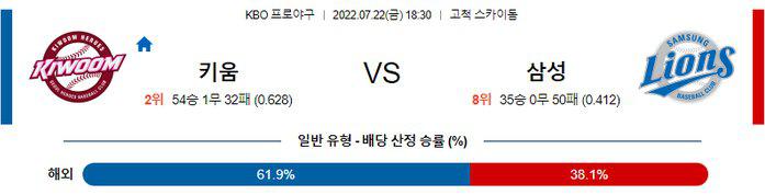 11연패에 빠진 가운데 전반기를 마무리한 삼성 이다. 또한, 선발 투수의 올시즌 상대전 기록에서 제법 많은 차이가 발생하는 경기. 키움 승리 가능성을 추천 한다.