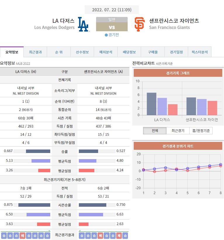 [스포츠분석][MLB분석] 7월 22일 MLB 분석 LA다저스 VS 샌프란시스코안녕하세요 스포츠 리포터 세린입니다.