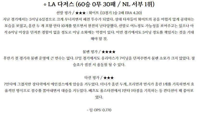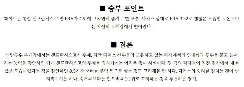 안녕하세요 스포츠 리포터 세린입니다. 오늘 MLB 분석은 LA다저스 VS 샌프란시스코 분석 준비했습니다. 분석글은 라인업 확인 전 초안입니다! 최종 경기 조합 픽이나 분석 영상은 유튜브 [스포츠 리포터 세린] 검색 후 확인 해주시면 감사하겠습니다! LA다저스 VS 샌프란시스코 [LA다저스] 다저스는 이번 경기 미첼 화이트 선수가 선발로 등…