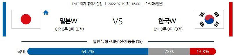 후술하겠으나, 대회 첫 경기이기도 하며, 앞선 맞대결에서도 언더(2.5 기준)가 나온 점을 고려하면 이번 일정도 언더(2.5 기준)의 가능성이 매우 높겠다. 또한 일본은 여자 축구의 강자지만, 이번 일정에서는 해외파 대부분이 포함되지 않았으며, 지난 아시안컵 대회에서도 한국과 1-1 무승부, 중국에게 4강전에서 승부차기 끝에 패하는 등 매우 강력한 모습까지는 보이지 못하고 있다. 한국은 아시안컵 준우승의 기세를 이어 가장 최근 평가전에서 지난 해 올림픽 우승 팀인 캐나다와 무승부를 거두는 등 나름대로 벨 감독 아래 팀이 단단해졌다. 이번 일정에서도 승리까지는 어렵겠지만, 월드컵중계 무승부는 충분히 가능하겠다.