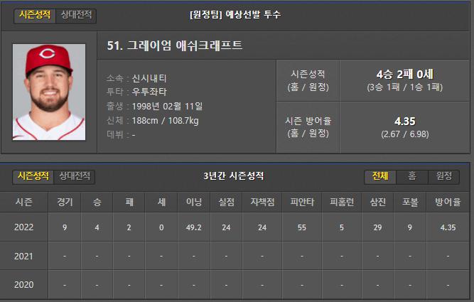 신시내티는 이번 경기 그레이엄 애쉬크래프트 선수가 등판합니다.