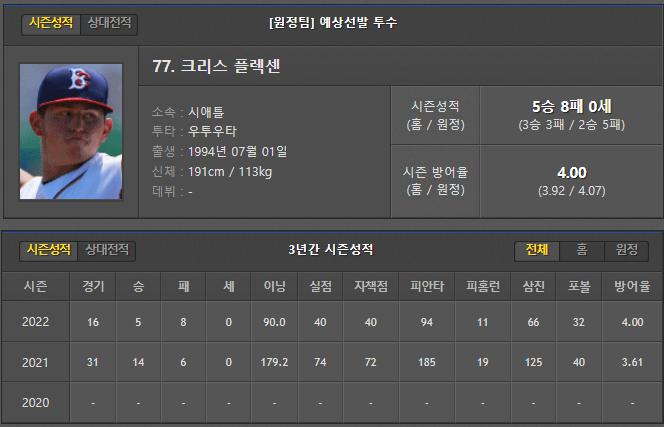 플렉센 선수는 이번 시즌 16경기 5승8패