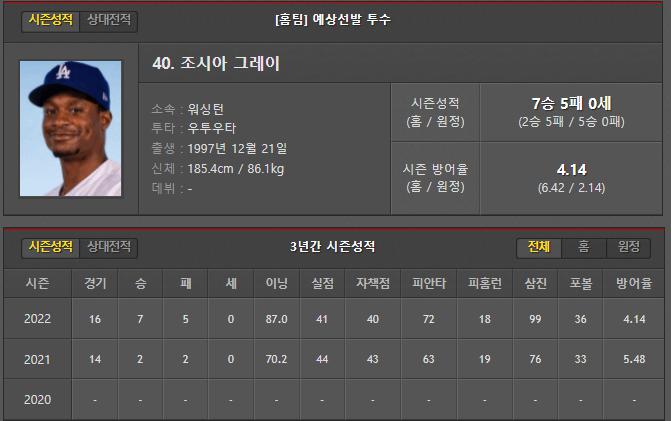 다만 홈에서 2승 5패 평균 자책점 6.42로 이상하게도 홈에서 부진한 그레이입니다.