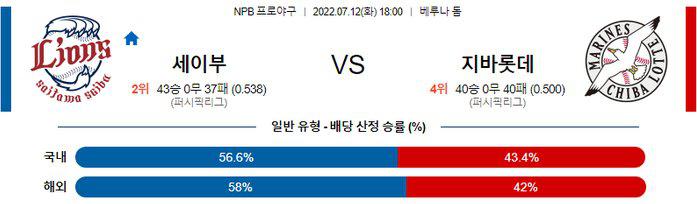 지난주 3연승 흐름 속에 5승1패를 기록한 세이부와 2연패에 빠져 있는 가운데 3승3패 성적을 기록한 지바롯데의 만남 이다. 6월21일 지바롯데 상대로 7.2이닝 무실점 승리를 기록한 마츠모토 와타루 투수에 대한 기대치가 높은 선발 매치업이며 팀 리듬에서도 세이부의 손을 들어줄수 있는 타이밍 이다. 세이부 승리 가능성을 추천 한다.