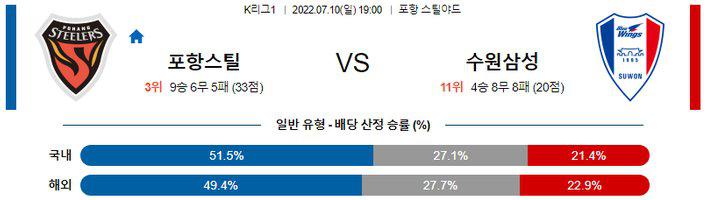 포항의 승리가 유력하다. 공격적인 성과에서 포항이 수원삼성보다는 뎁스와 최근 성과에서 우세한 모습이다. 다만 포항의 수비진도 최근 실점을 완벽히 제어하지는 못하고 있고, 포항과 수원의 경기가 매번 팽팽하게 이어지는 경우가 많아 언오버(2.5)와 핸디캡(-1.0) 승리는 변수가 상당부분 존재하는 편이다. 포항 승리를 최우선 픽으로 삼는 것이 좋을 것이다.