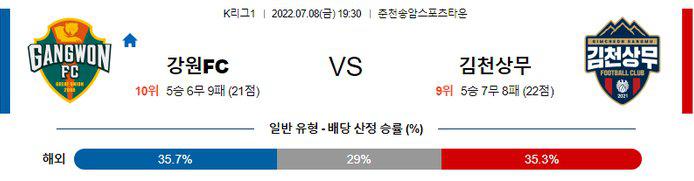 다득점 페이스를 염두에 둘 만 하다. 강원은 발샤의 빠른 적응과 이정협의 복귀로 공격진의 뎁스와 꾸준함을 기대할 수 있게 되었고, 김천 역시 공격진에서의 득점 분산이라는 숙제를 어느 정도 해결한 상태다. 양 팀이 모두 득점 성과를 내면서 경기가 혼전으로 이어질 가능성이 높다는 점을 감안한다면 무승부 가능성도 점쳐볼 수 있을 것이다. 다만 주력으로 가장 추천할 수 있는 픽은 오버(2.5)다.