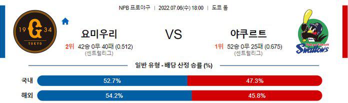 올시즌 요미우리는 메르세데스 투수가 선발로 나온 11경기에서 9승2패의 높은 승률을 기록하고 있다. 또한, 전일 경기에서 1-4 패배를 당하는 과정에서 야쿠르트는 투타 모두가 부진했다. 요미우리 승리 가능성을 추천 한다.