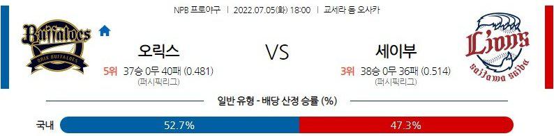 지난주 2승4패 성적을 기록한 오릭스와 5연승이 중단 된 이후 2연패에 빠져 있는 세이부의 만남 이다. 미야기 히로야 투수에 대한 기대치가 높은 선발 매치업이며 팀 리듬에서도 오릭스의 손을 들어줄수 있는 타이밍 이다. 오릭스 승리 가능성을 추천 한다.