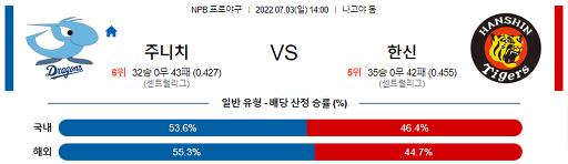 주니치 야나기는 이전 경기 6월 26일, 한신 타선을 상대로 7이닝, 9개의 피안타, 3실점으로 마운드를 내려왔다.금년 한신과 3경기, 23이닝, 1승 0패, ERA 2.35, 강세를 보이고 있는 야나기는 최근 2연패를 당하고 있지만, 평균 7이닝 이상을 던지며 스테미너 피칭을 보이고 있다. 오늘도 긴 이닝을 소화하며 자신감의 피칭으로 나카노, 치카모토 등 최근 잘 맞고 있는 한신 타선을 봉쇄하며 승운을 잡을 것으로 기대한다.한신 사이키는 2018년 22경기, 6승 10패로 활약했으나, 이후 부진, 작년 수술, 어려운 시즌을 보냈으나, 구보타 2군 투수 코치의 천거로 이전 5월부터 1군에 올라와 벤치에서 마운드에 오를 날을 기다렸다. 오늘 첫 상대하는 맹물 주니치 타선을 상대로 3이닝을 넘기겠지만, 상대가 야나기로 타선의 지원이 어려운 상황에서 고전의 피칭이 예상된다.홈팀 주니치의 승리를 예측한다.