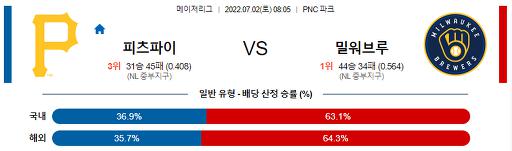 7월 2일 08:05 MLB 피츠버그 : 밀워키