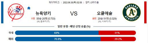 6월 30일 02:05 MLB 뉴욕양키스 : 오클랜드