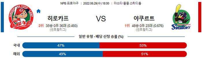 선발 싸움에서 엔도 아츠시 투수에 대한 기대치가 높다. 하라 쥬리 투수가 직전경기에서 승리를 기록했지만 투구내용은 불안했다고 생각되며 전일 경기에서 3-6, 패배를 당했지만 히로시마는 야쿠르트 보다 3개가 더 많은 11안타 경기를 했다. 히로시마 승리 가능성을 추천 한다.