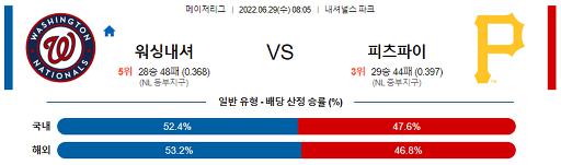 6월 29일 08:05 MLB 워싱턴 : 피츠버그