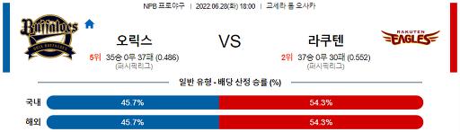 미야기는 이전 경기 6월 21일, 소프트뱅크 타선을 상대로 7.1이닝, 5개의 피안타, 2실점으로 승리투수가 됐다. 최근 오릭스는 야마모토의 노히트노런, 다지마, 야마오카의 완봉, 철벽 로테이션을 보이고 있는 좋은 상황이다. 미야기는 5월 22일, 라쿠텐 타선을 6이닝, 1실점으로 봉쇄했다. 오늘 좋은 팀 분위기에 편승한 피칭으로 아사무라, 시마우치 등 라쿠텐 장거리포를 봉쇄하며 승운을 잡을 것으로 기대한다.노리모토는 이전 경기 6월 21일, 니혼햄 타선을 상대로 6.2이닝, 3개의 피안타, 무실점으로 승리투수가 됐다. 우승 후보 라쿠텐이 타선의 부진으로 리그 1위 자리를 내주고 있다. 금년 오릭스와 2경기, 0승 1패, ERA 4.85로 어두운 성적을 보이고 있는 노리모토, 목하 3연승을 달리고 있지만, 타선의 지원이 어려운 상황이다. 터지기 시작한 주포 요시다, 장거리 스기모토 등 오릭스 타선을 상대로 오늘 고전의 피칭이 예상된다.홈팀 오릭스의 승리를 예측한다.