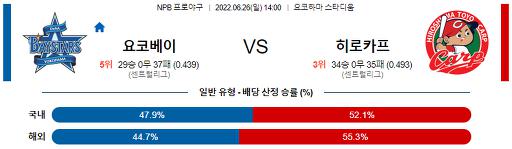 요코하마는 어제, 선발 하마구치가 4이닝, 6개의 피안타, 5실점으로 패전투수가 됐고, 이어 던진 5명의 불펜의 무실점, 타선이 11안타 4득점으로 분전했으나 아쉽게 경기를 내주고 말았다. 오늘 선발 교야마는 직전 경기 6월 19일, 한신 타선을 상대로 5+이닝, 4개의 피안타, 3실점으로 마운드를 내려왔다. 금년 4경기, ERA 1.80, 안정감의 피칭이지만, 확실하게 경기 장악력이 없는 교야마, 히로시마 타선이 다시 폭발력을 보이기 시작했다. 오늘 시즌 첫 상대하는 기쿠치, 사카쿠라, 우에모토와 등 히로시마 불망방이 타선을 상대로 경기 초반 흔들리며 고전의 피칭이 예상된다. 히로시마는 25일, 선발 모리시타가 7이닝, 9개의 피안타, 4실점으로 승리투수가 됐고, 이어 2명의 불펜이 무실점, 타선이 11안타 5득점으로 분전하며 5-4, 경기를 승리로 이끌었다. 오늘 선발 구리는 직전 경기 6월 19일, 야쿠르트 타선을 상대로 5이닝, 6개의 피안타, 피홈런 4개, 5실점으로 패전투수가 됐다. 최근 2연패를 당하며 패전이 앞서고 있는 구리, 그렇지만 평균 6이닝을 소화하며 호투하고 있다. 오늘 이 여세를 몰아 시즌 첫 상대하는 사노, 마키, 미야자키 등 요코하마 중심 타선을 봉쇄하며 승운을 잡을 것으로 기대한다. 원정팀 히로시마의 승리를 예측한다.