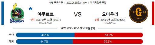 야쿠르트는 어제, 선발 스니드가 5이닝, 9개의 피안타, 피홈런 3개, 7실점으로 패전투수가 됐고, 이어 2명의 불펜이 12실점, 홈런포 2방이 터졌고 타선이 9안타 5득점으로 분전했으나 경기를 내주고 말았다. 오늘 선발 수아레즈는 직전 경기 6월 18일, 히로시마 타선을 상대로 4이닝, 5개의 피안타, 피홈런 1개, 2실점으로 마운드를 내려왔다. 시즌 4경기, 5이닝을 넘기지 못하고 있는 상황이며, 등판일에 이상하게도 불방망이 타선의 도움도 없는 수아레즈, 오늘 터지기 시작한 주포 오카모토를 비롯한 요미우리 타선에게 얻어맞으며 마운드를 내려올 우려가 크다. 요미우리는 25일, 선발 슈메이커가 5.1이닝, 7개의 피안타, 피홈런 1개, 4실점으로 승리투수가 됐고, 이어 4명의 불펜이 1실점, 6방의 홈런포가 터졌고, 타선이 19안타 19득점으로 폭발력을 보이며 19-5, 완승을 거두었다. 오늘 선발 도고는 직전 경기 6월 21일, 요코하마 타선을 상대로 7이닝, 6개의 피안타, 피홈런 1개, 1실점으로 마운드를 내려왔다. 도고는 금년 야쿠르트와 1경기, 7이닝, 6개의 피안타, 2실점으로 승리를 챙겼다. 경기 당 평균 7이닝을 소화하며 호투하고 있는 도고는 최근 주포 무라카미를 비롯한 불방망이 야쿠르트 타선을 봉쇄하며 승운을 잡을 것으로 기대한다. 원정팀 요미우리의 승리를 예측한다.