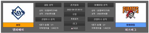 [템파베이]템파베이의 선발투수는 좌완 제프리 스피링스다.제프리 스프링스는 이번 시즌 17경기 중 9경기에 등판해 3승 2패 2.00 era를 기록하고 있다.제프리 스프링스는 선발 전환이후에도 어느 정도 준수한 모습을 보여주며 선발로 자리 잡고 있는 상황이다.제프리 스프링스는 피츠버그 타선 중 3명만을 상대로 4타수에서 1피안타를 허용한 경험이 있다.마이클 채비스 상대로 1타수에서 무피안타 마이클 페레즈 상대로 1타수에서 1피안타 대니얼 보겔바흐 상대로 2타수에서 무피안타를 허용한 경험이 있다.템파베이는 최근 9경기에서 2승 7패를 기록하며 매우 아쉬운 모습을 보여주고 있다.팀 상황이 매우 좋지 않다.타선의 부진이 지속되고 있는 템파베이다.템파베이 불펜의 필승조 마무리 콜린 포치 셋업 제이슨 애덤 브룩스 레일리로 이루어져있다.이들 필승조는 21일 경기에 패전을 당하며 주춤했지만 22일 23일 경기에 연달아 등판해 홀드와 세이브를 기록하며 아주 좋은 모습을 보여주었다.이들 필승조는 하루 휴식을 취했기 때문에 이번 경기에 문제 없이 등판이 가능할 것으로 보인다.[피츠버그]피츠버그의 선발투수는 우완 미치 켈러다.미치 켈러는 이번 시즌 13경기 중 11경기에 등판해 2승 5패 4.72 era를 기록하고 있다.미치 켈러는 구위가 떨어진 상황이고 제구 역시도 아쉬운 상황이다.미치 켈러는 최근 등판에서도 아쉬운 모습을 보여주었다.미치 켈러는 템파베이 타선을 처음으로 상대하게 되었다.이번 경기에서는 좋은 제구가 필요한 미치 켈러다.피츠버그는 최근 5경기에서 4승 1패를 기록하며 매우 좋은 모습을 보여주고 있다.피츠버근느 타선에서 브라이언 레이놀즈 잭 스윙스키 대니얼 보겔바흐가 중심타선에서 매우 좋은 모습을 보여주고 있다.이들의 활약으로 대량득점에 성공한 피츠버그의 타선이다.피츠버그 불펜의 필승조 마무리 데이비드 베나 셋업 윌 크로우 크리스 스트랜튼으로 이루어져있다.이들 필승조는 최근 등판이 적은 상황이다.이들 필승조는 체력이 충분히 남아있기 때문에 이번 경기에 문제 없이 등판이 가능할 것으로 보인다.[결론]스프링스가 직전 경기 고전하는 모습을 보이기는 하였지만 이번시즌 경기 내용은 나쁘지 않다.무엇보다 피츠버그를 처음 상대하는 이점이 작용할 가능성이 높아보인다.켈러도 최근 좋은 모습으로 팀을 이끌어 주고있다.탬파베이와의 맞대결이 없다는점도 기대요소이다.탬파베이의 부상여파가 부담이기는 하지만 그래도 홈 경기에서는 탬파베이의 투수력에 기대를 가져 볼 수 있다.이 경기는 7.5언더를 추천한다.승패 탬파베이 승