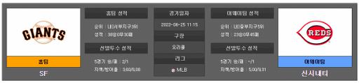 [샌프란시스코]샌프란시스코의 선발투수는 우완 알렉스 콥이다.알렉스 콥은 이번 시즌 9경기에 등판해 3승 2패 5.62 era를 기록하고 있다.알렉스 콥은 이번 시즌 구위가 떨어진 모습을 보여주면서 부진한 성적을 거두고 있다.알렉스 콥은 쉽사리 타자들의 방망이를 이겨내지 못하고 있다.매경기 투구수가 많아 많은 이닝을 소화하지 못하고 있다.알렉스 콥은 신시네티 타선을 상대로 42타수에서 10피안타를 허용한 경험이 있다.마이크 무스타커스 상대로 15타수에서 5피안타 1피홈런 조이 보토 상대로 10타수에서 2피안타 브랜든 더리 상대로 3타수에서 1피안타를 허용한 경험이 있다.샌프란시스코는 최근 5경기에서 1승 4패를 기록하며 매우 아쉬운 모습을 보여주고 있다.샌프란시스코는 현재 타선에서 에반 롱고리아 브랜드 벨트가 모두 부진하고 있다.작 피더슨과 마이크 야스트렘스키가 분전하고 있지만 역부족이라는 평가다.샌프란시스코 불펜의 필승조 마무리 카밀로 도발 셋업 도미닉 레온 제이크 맥기가 21일 경기에 패전을 기록하며 아쉬운 모습을 보였고 22일 경기에는 홀드와 승리를 기록했지만 이후 경기에서 매우 아쉬운 모습을 보여주며 기복이 심한 모습을 보여주고 말았다.이들 필승조는 이후 경기에서 휴식을 취했기 때문에 이번 경기에 문제 없이 등판이 가능할 것으로 보인다.[신시내티]신시네티의 선발투수는 우완 그라함 애쉬크래프트다.애쉬크래프트는 이번 시즌 6경기에 등판해 3승 1패 3.51 era를 기록하고 있다.애쉬크래프트는 경험이 적지만 준수한 모습을 보여주었지만 직전 경기에는 아쉬운 모습을 보여주었다.애쉬크래프트는 샌프란시스코 타선을 상대로 18타수에서 4피안타를 허용한 경험이 있다.브랜든 크로포드 상대로 3타수에서 2피안타 에반 롱고리아 상대로 2타수에서 1피안타 작 피더슨 상대로 3타수에서 1피안타를 허용한 경험이 있다.신시네티는 7연패를 기록하면서 매우 아쉬운 모습을 보여주고 있다.타선에서 토미 팸 조이 보토등 베테랑 타자들이 모두 부진한 모습을 보여주면서 어려운 경기를 펼치고 있다.지난해 좋은 모습을 보여주었던 조나단 인디아 역시 아쉬운 경기를 펼치고 있다.신시네티 불펜의 필승조 마무리 헌터 스트릭핸드 조엘 큐헬 셋업 제프 호프만 루이스 세사로 이루어져있다.이들 필승조는 현재 팀이 연패를 당하면서 등판기회를 잡지 못하고 있다.이들 필승조는 이번 경기에 문제 없이 등판이 가능할 것으로 보인다.[결론]콥의 피안타율을 감안한다면 고전 할 가능성도 충분하다.하지만 이번시즌 이미 신시내티를 상대로 좋은 모습을 보였고 타선 상대전적도 나쁘지 않다.신시내티의 선발인 애쉬크레프트가 기대 이상의 모습을 보여준것은 사실이다.하지만 경험 부족은 원정 경기에서 이닝 소화력 부족으로 나타는 모습이다.샌프란시스코의 타선 흐름이 크게 좋은것은 아니지만 홈으로 돌아오는 경기인만큼 홈 경기력을 충분히 살려 낼 것으로 보인다.이 경기는 샌프란시스코의 승리를 추천한다.언오버 7.5오버