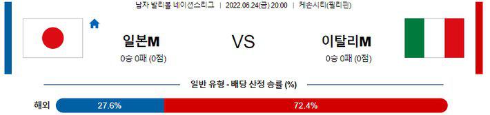 필리핀 중립구장 경기로 펼쳐지는 경기다. 도쿄올림픽에서 이탈리아는 신들의 리그에서 뛰고 있는 이시카와 유키를 봉쇄하는데 성공하며 일본을 3-1로 제압한 좋은 기억이 있다. 하지만, 2주차 경기 일정을 치르고 있는 이탈리아는 주축 선수들의 불참으로 100% 전력이라고 볼수 없고 최근 5차례 국제대회에서 성적 역시 이탈리아의 3승2패, 근소한 우위라는 것을 체크해야 한다. 승패의 접근 보다는 오버 가능성을 노려야 하는 경기다.