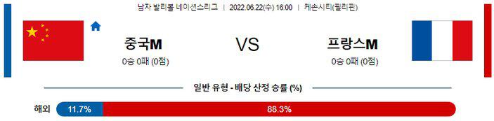 필리핀 중립구장에서 펼쳐지는 경기다.1주차 마지막 경기에서 폴란드에게 완패를 당한 것이 프랑스 선수들에게 좋은 약이 되어줄 것이다. 또한, 핸디캡 승부에서는 이번대회 셧아웃 패배가 없는 중국 이라는 것을 참고해야 한다. 프랑스 승리 가능성을 추천 한다.