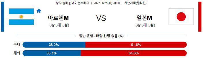 필리핀 중립구장에서 펼쳐지는 경기다. 아르헨티나는 주전 세터 산체스의 낮은 신장이 상대 공격의 집중 표적이 되고 있다. 울며겨자먹기로 지라우도의 출전 시간을 늘리며 낮은 블로킹의 약점을 보완하려고 했지만 지라우도 세터는 공격수들의 입맛에 맞는 토스의 배달 횟수가 산체스 세터 보다 부족한 상황. 일본 승리 가능성을 추천 한다.