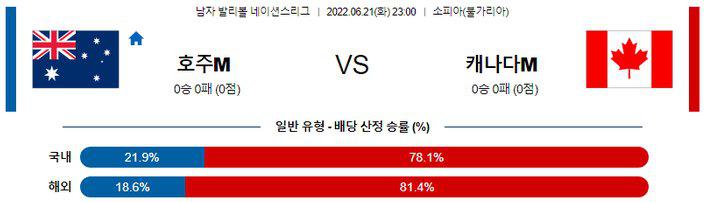 불가리아 중립구장 경기로 펼쳐지는 경기다. 호주는 서브 정확도가 떨어지는 팀 이다. 캐나다가 승점 3점을 가져갈 것으로 예상되지만 캐나다의 경기력 기복 현상을 감안한다면 호주가 1개 세트 정도는 가져갈 가능성을 배제할수 없다. 캐나다 승리 가능성을 추천 한다.