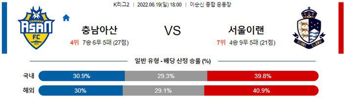 충남아산이 저자세의 경기 운영으로 최근 5경기 중 4경기에서 언더(2.5 기준)를 기록한 점, 서울이랜드도 공격이 매우 무뎌 최근 6경기 중 4경기에서 언더(2.5 기준)를 기록한 점을 고려하면 언더(2.5 기준)의 가능성이 높겠다. 또한 후에 언급하겠지만, 서울이랜드는 최근 홈 4연전에서 단 1승도 거두지 못한 상황. 범위를 더 넓히면 최근 16경기 중 뒤에서 1, 3위를 차지하고 있는 부산과 김포전 승리를 제외한 14경기에서 승리가 없다. 반면, 충남아산은 직전 경기에서 ‘대어’ 대전을 낚으며 4위까지 올라섰다. 기세가 매우 좋다. 여기에 충남아산의 홈 버프까지 더해지기 때문에 충남아산의 승리가 예상된다.