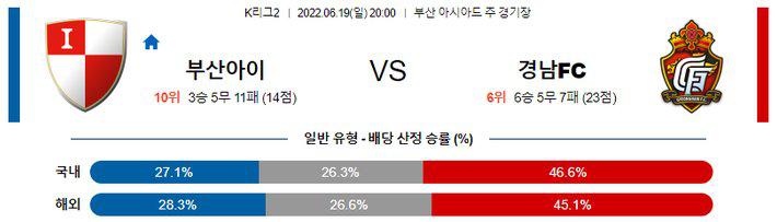 부산이 직전 경기에서 오버(2.5 기준)를 기록한 점, 경남도 이번 시즌 최다 득점 팀, 최다 실점 2위 팀 이라는 점을 고려하면 오버(2.5 기준)의 가능성이 높겠다. 또한 후술하겠지만, 부산은 박진섭 감독 선임 이후 경기력이 살아나면서 1승 1무를 기록 중. 분위기 전환에 성공했다. 경남도 브라질 3인방을 비롯한 공격력이 매우 뛰어나기 때문에 승리까지는 어렵겠으나, 무승부 정도는 고려해 볼 만한 선택지다.